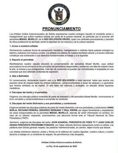 «Los Artistas Unidos Autoconvocados de Bolivia expresamos nuestro enérgico repudio al constante acoso y hostigamiento que sufren nuestros artistas por parte de la prensa nacional, en particular por el accionar del periodista Misael Murillo, de la Red Bolivisión Oruro, quien con actitudes provocadoras y carentes de ética profesional ha atentado contra la dignidad de los músicos y de la cultura nacional», se lee en la primera parte del pronunciamiento.
